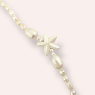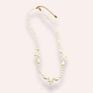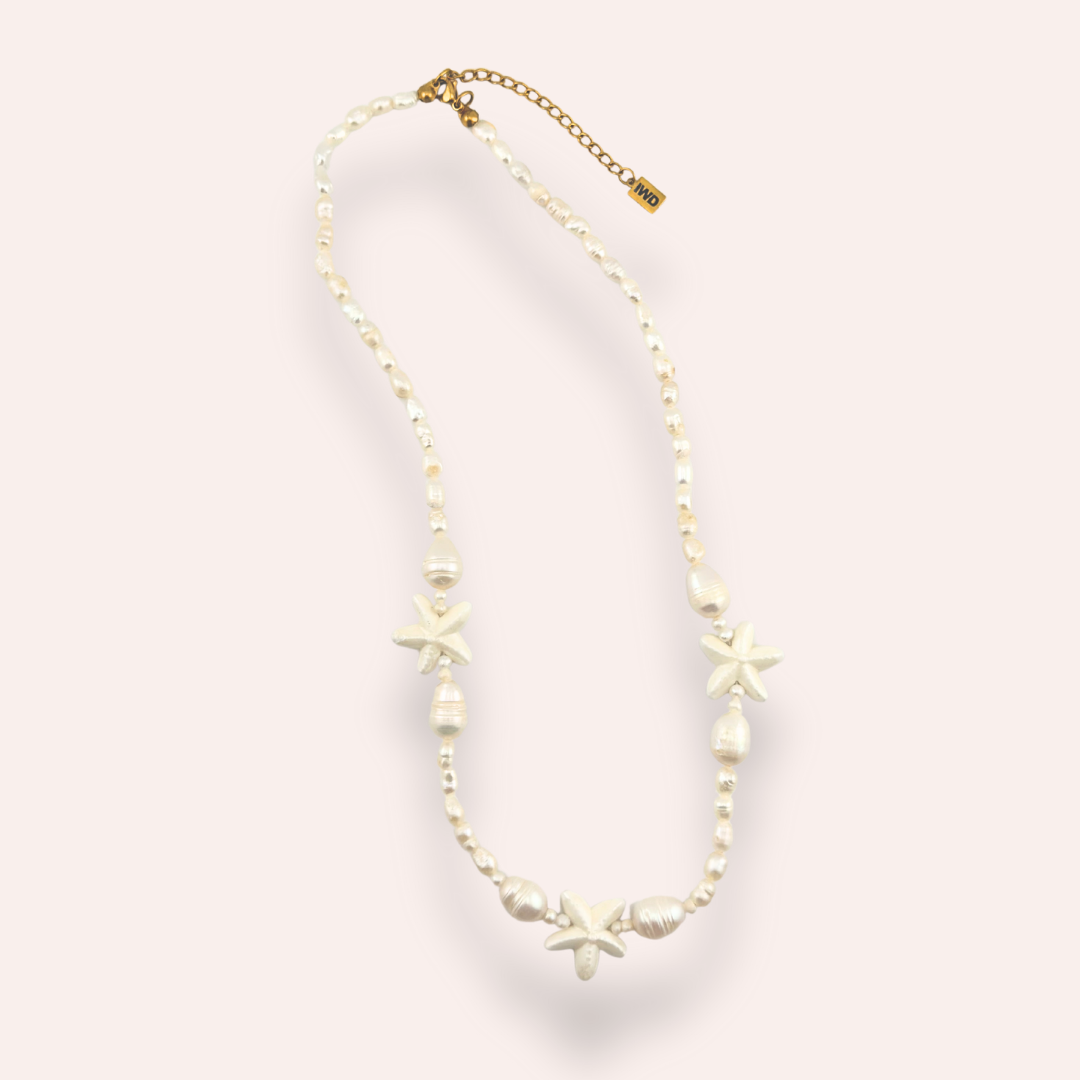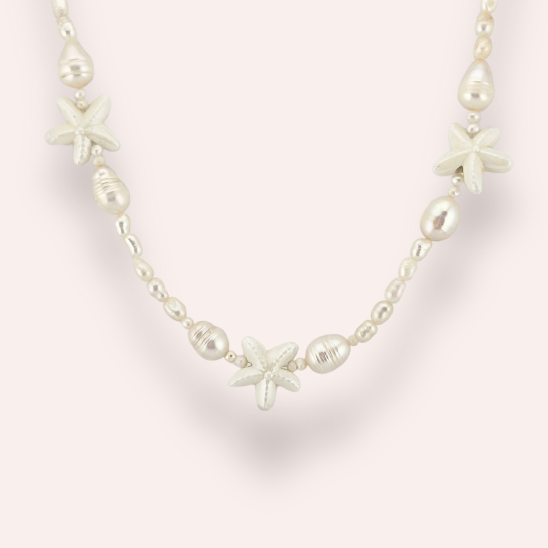 The Serena Necklace is your little piece of the sea, wherever summer takes you. With natural pearls and soft starfish details, it brings an easy, breezy glow to any look. The soft white of the pearls is also the perfect bridge between your gold and silver necklaces, making it your most versatile beach-day essential.
