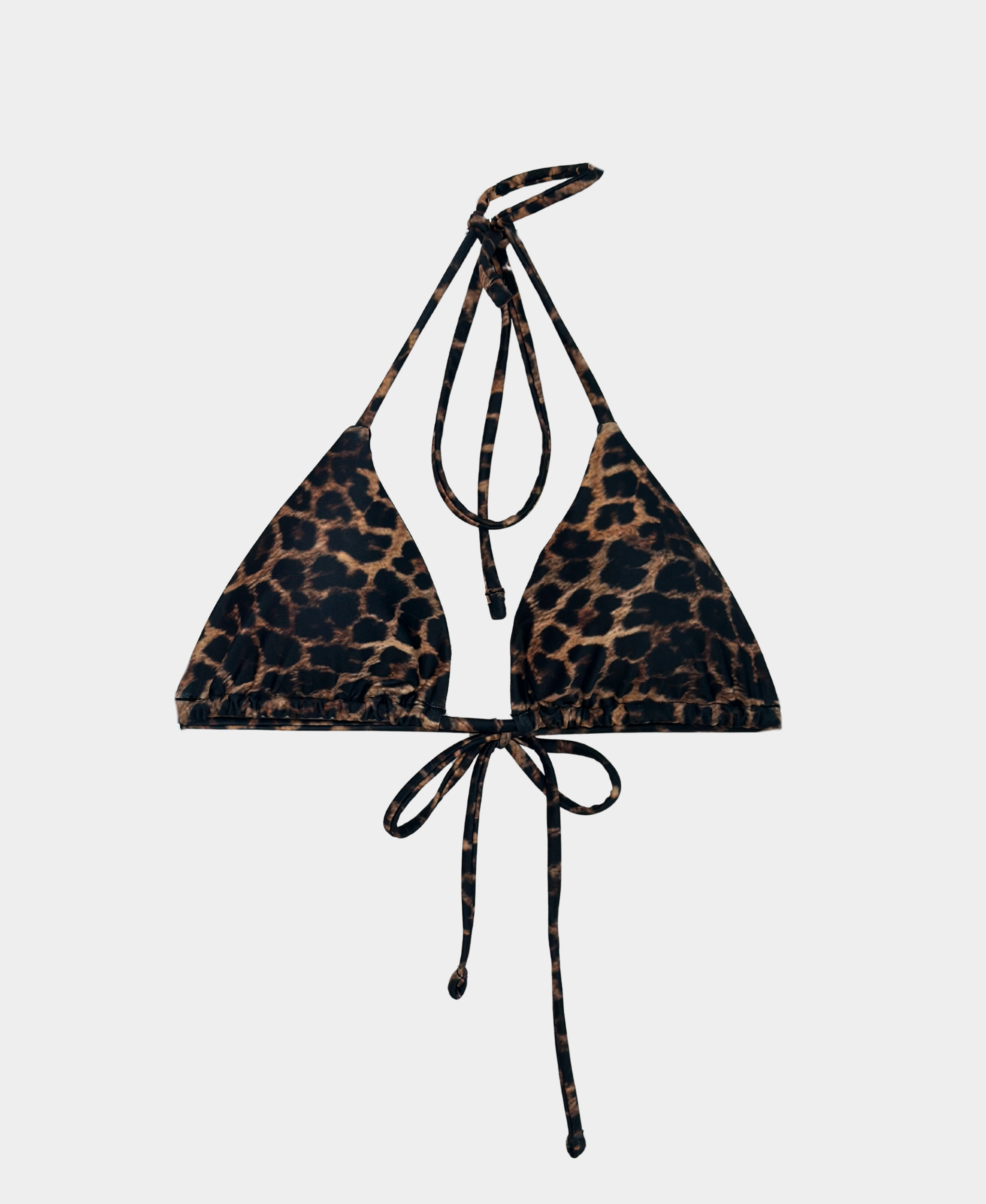 Triangle bikini top in Savanna with a wild leopard fabric. Adjustable ties at the neck and back, finished with sleek metal rings to attach your favorite charms. Note: Fabric may become slightly sheer when wet, depending on skin tone and contrast.