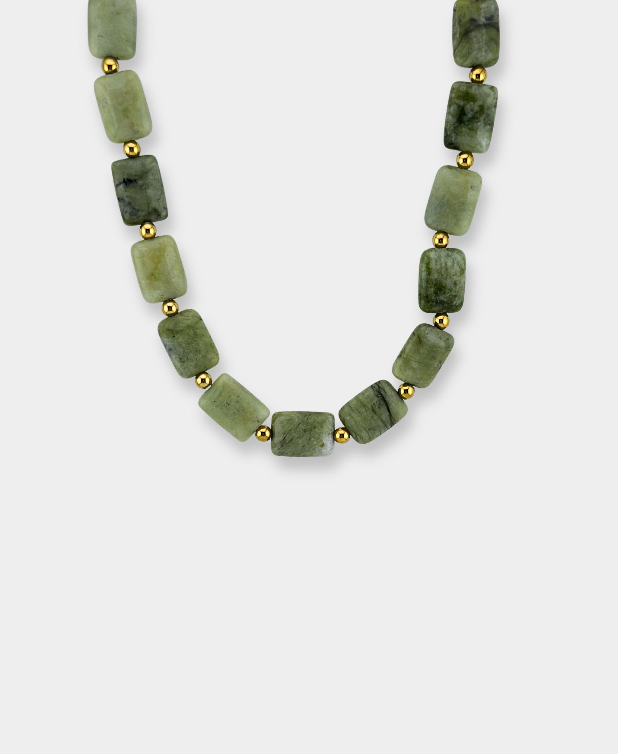 With rectangular green jade stones and gold stainless accents, the Wouna Necklace is serene and timeless. Each piece is handmade in Barcelona, waterproof, and non-tarnish, making it a perfect everyday signature.