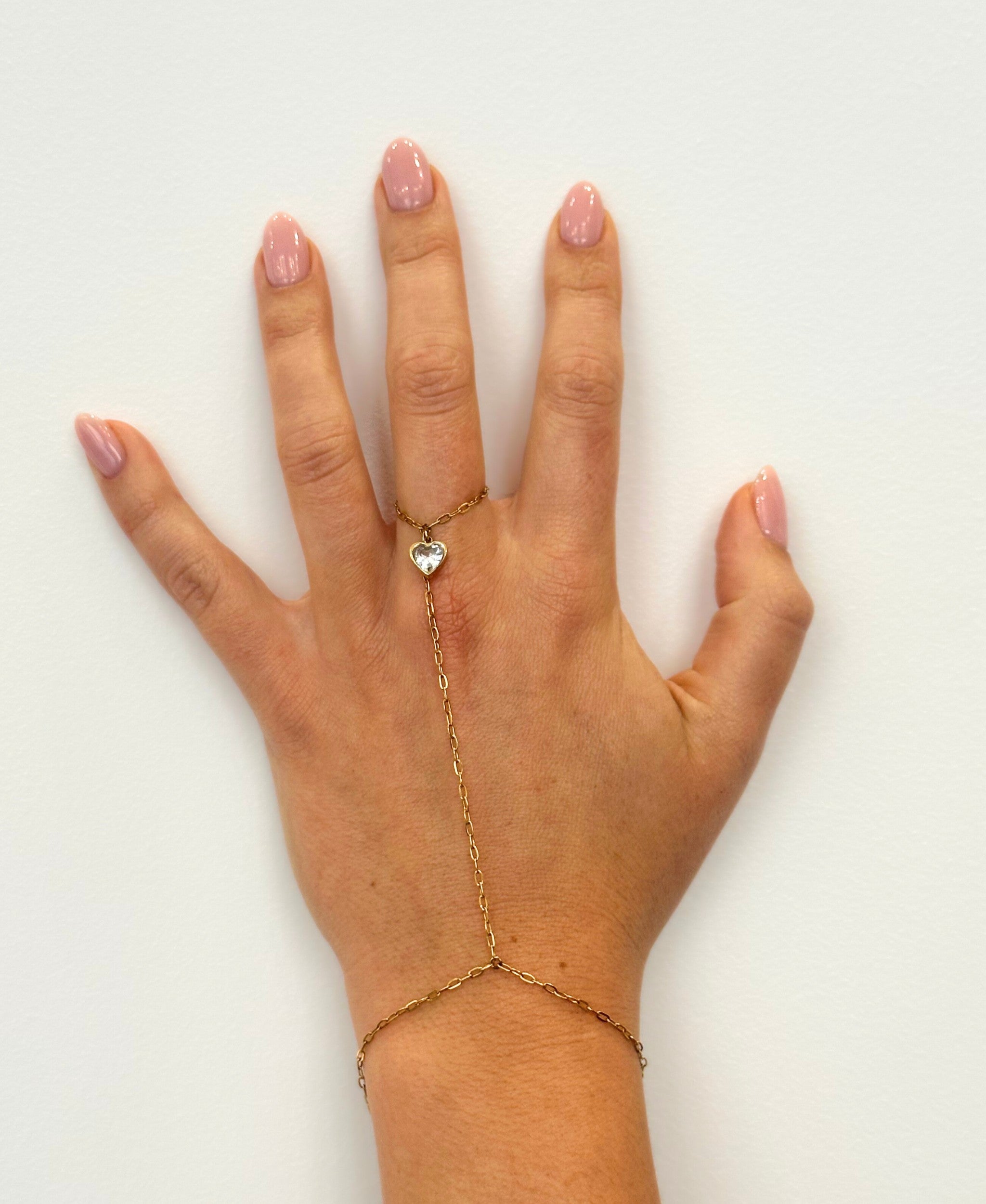A delicate hand chain featuring a faceted heart charm that rests elegantly on the finger. Crafted in high-grade stainless steel, waterproof and tarnish-free. Its lightweight construction offers everyday comfort with a refined, romantic touch.