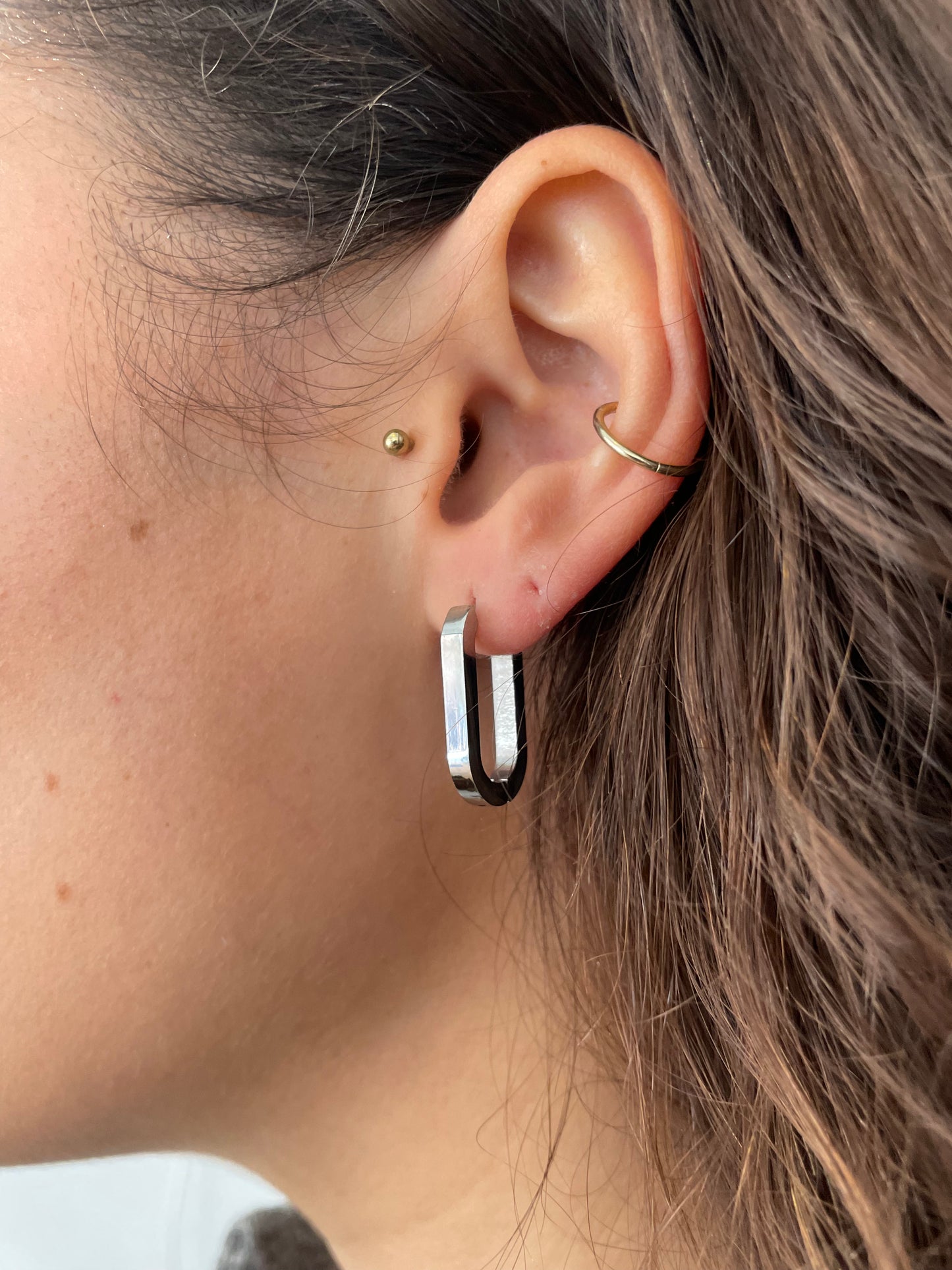 These Katie Silver hoops boast an elegant, long square shape, a classic look that never goes out of style. These earrings are lightweight and comfortable, perfect for everyday wear.