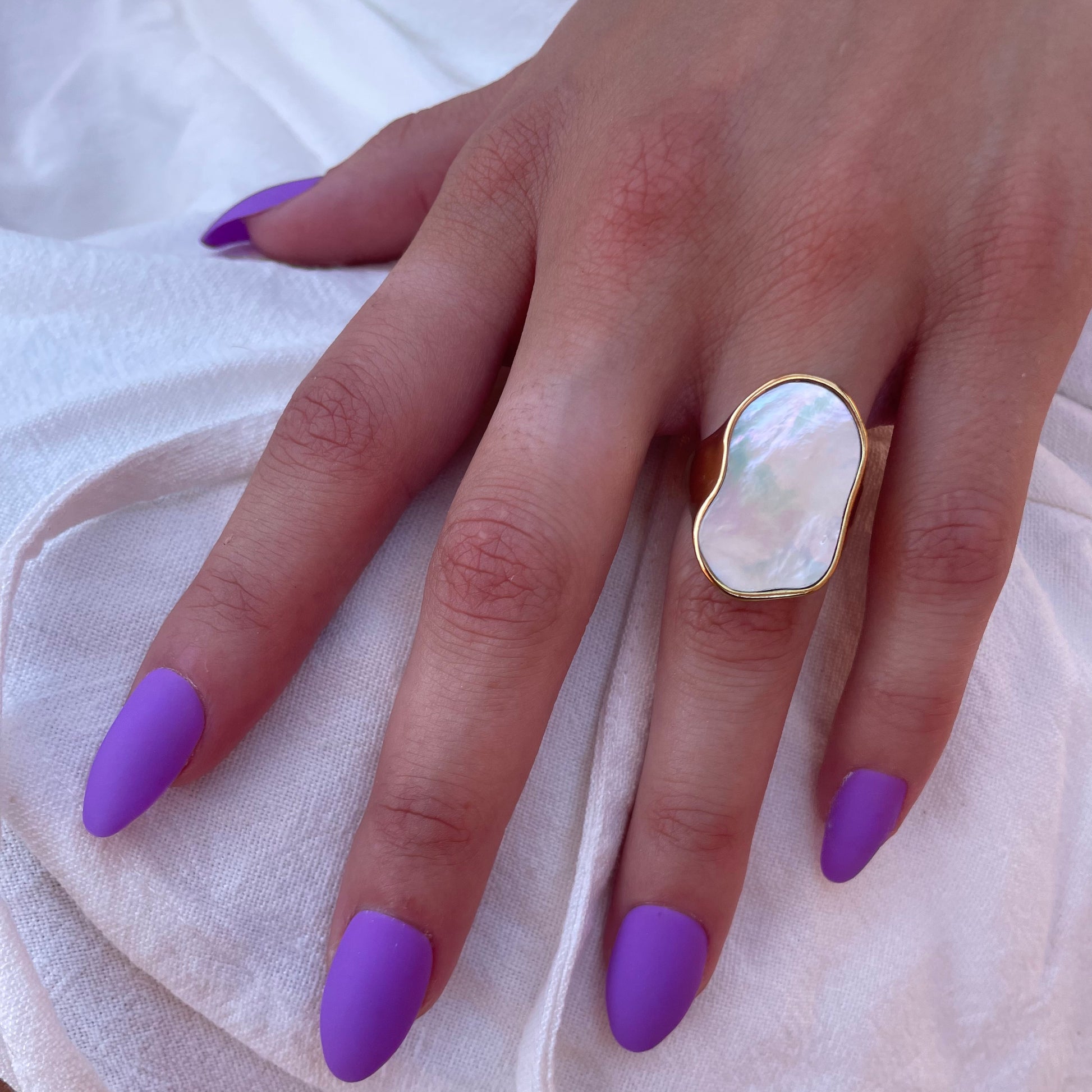 The Loua Ring is a stunning accessory featuring a large marble plate that elegantly complements any outfit.