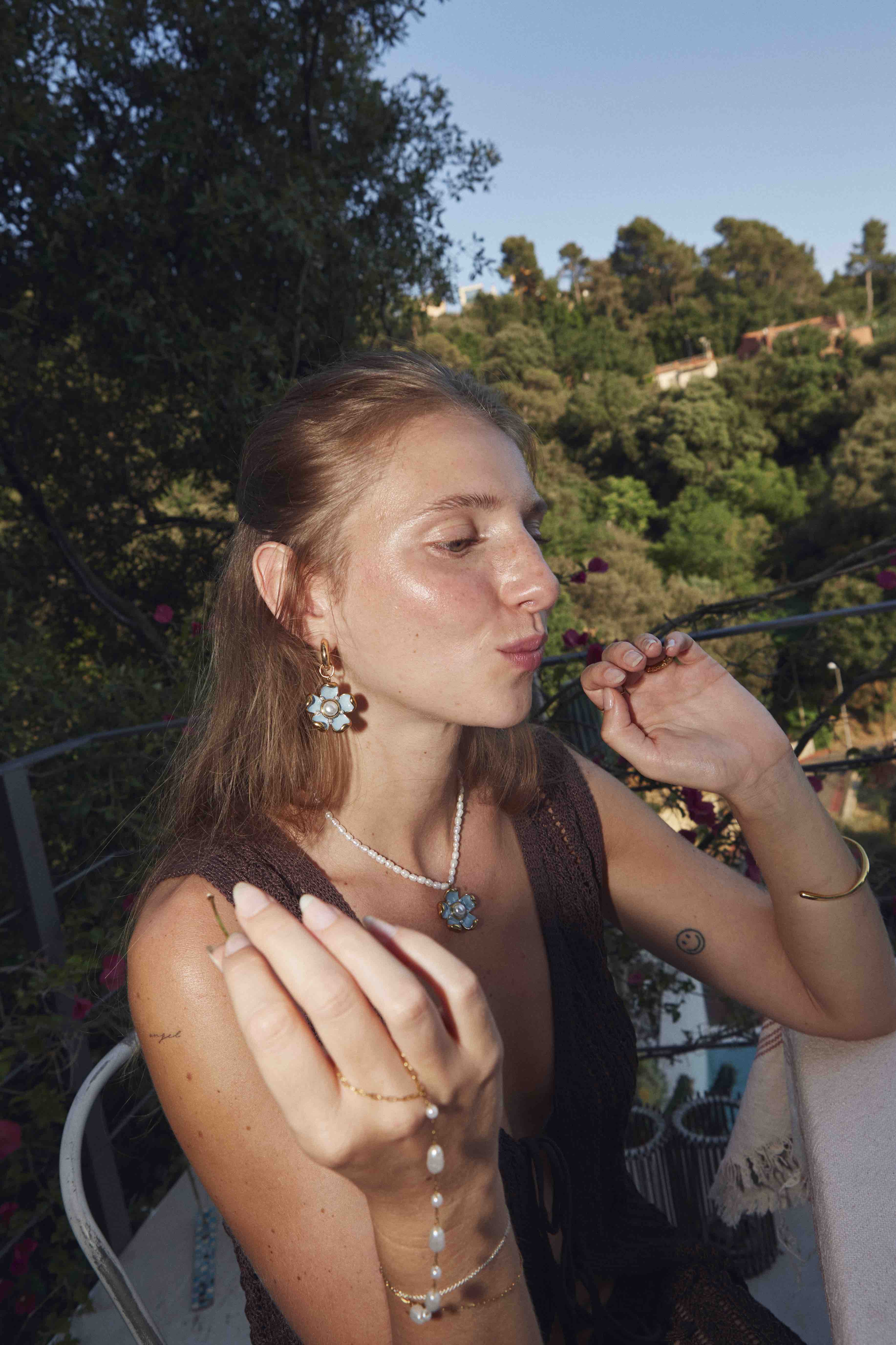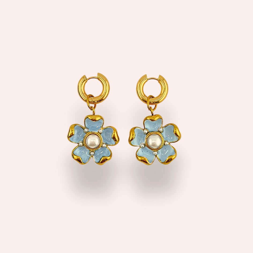 Inspired by carefree coastal days, the Sofia Earrings feature freshwater pearls and a summery light blue flower with radiant gold accents, capturing effortless style. Crafted with stainless steel for lasting shine, these earrings are perfect for your summer statement: joyful and fresh!